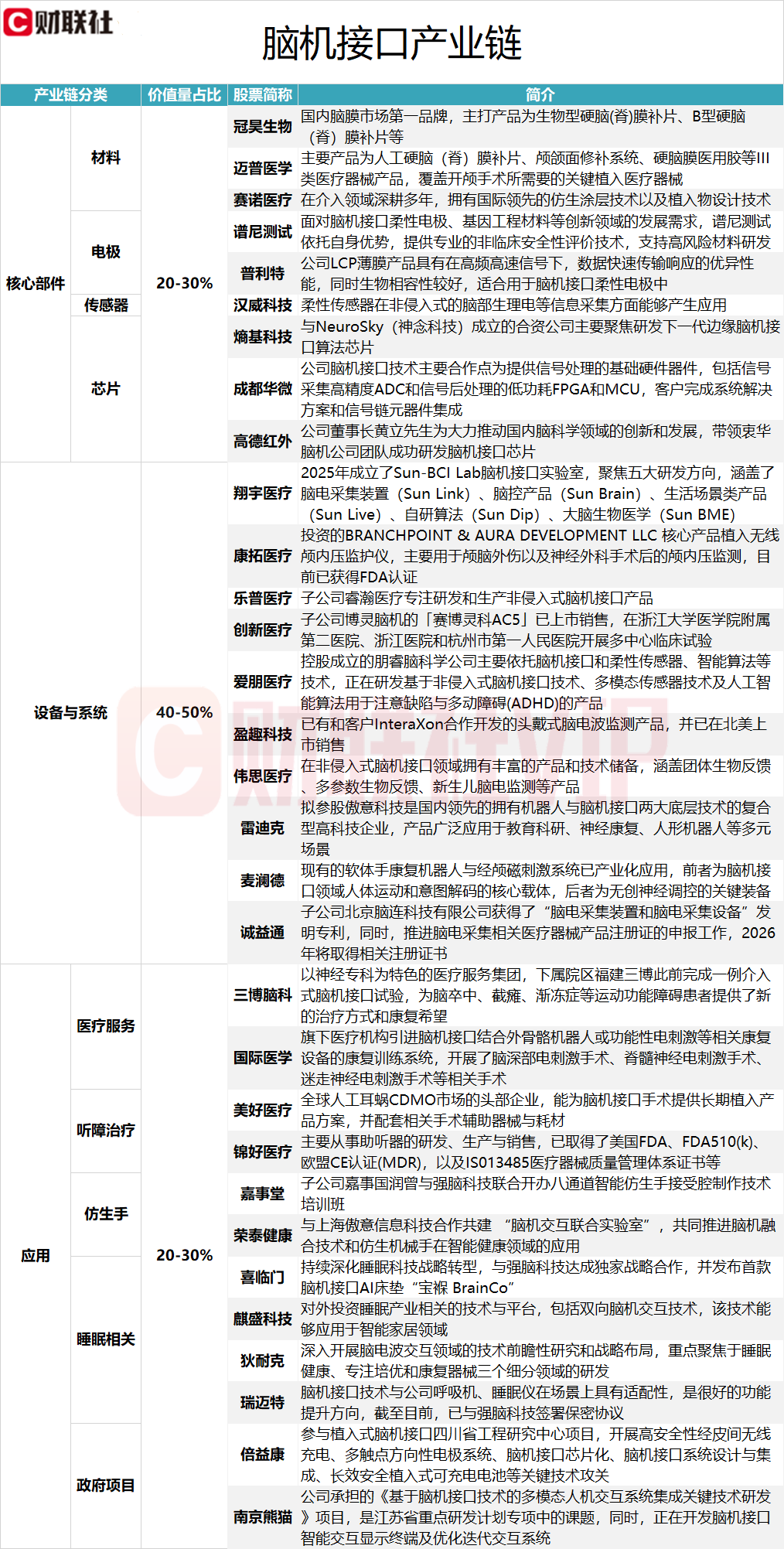 据财联社此前梳理,脑机接口产业链中,设备与系统这一部分的价值量占比最高,达40-50%。涉及上市公司包括翔宇医疗、康拓医疗、乐普医疗、创新医疗、爱朋医疗、盈趣科技、伟思医疗、雷迪克、麦澜德和诚益通,具体情况详见下图: