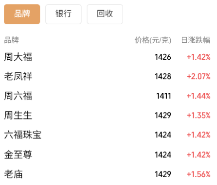 国内黄金饰品价格也普遍上涨,多个品牌足金报价突破1400元/克。其中,周生生、老庙足金饰品报价1429元/克,老凤祥足金饰品报价1428元/克,周大福足金饰品报价1426元/克,六福珠宝、金至尊报价1424元/克,较昨日普遍上涨了20元/克。