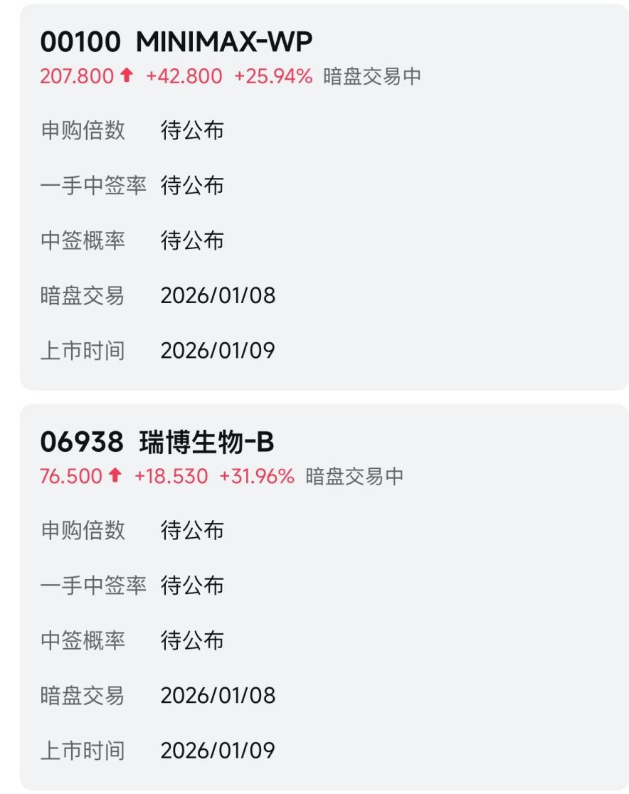 值得注意的是,在这3家公司的首日全部收红之际,1月9日上市的3家公司进入暗盘阶段后全部大涨,这也意味着2026年以来上市的7家公司或将全部大涨,港股IPO迎来开门红。