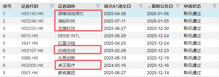 除上述公司外,还有湖南鸣鸣很忙、澜起科技、龙旗科技、白鸽在线以及卓正医疗已通过港交所聆讯,正在等待上市。
