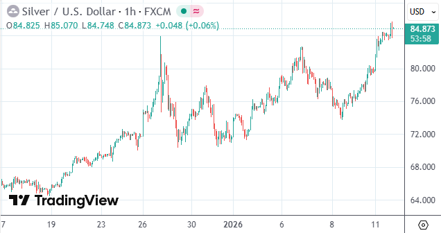 截至收盘,现货白银价格升超6%报每盎司85.15美元,日内一度涨逾7%至85.74美元;现货黄金则一度涨2.4%至每盎司4620.34美元,均刷新了2025年12月下旬录得的历史纪录。