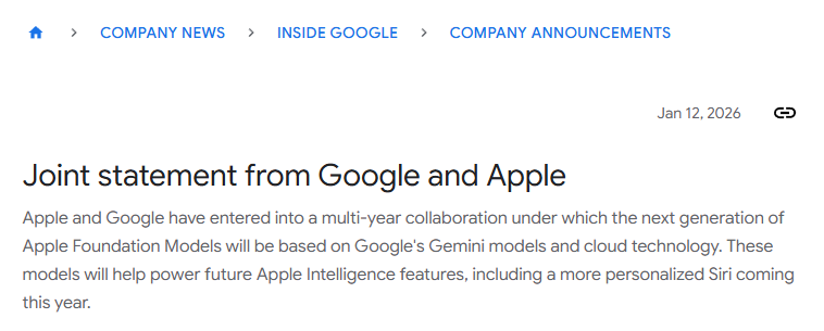 周一(1月12日),两家科技巨头都确认了这一消息。谷歌在官方博客写道,“苹果已与谷歌达成一项多年合作协议,根据该协议,下一代苹果基础模型(Apple Foundation Models)将基于谷歌的Gemini模型和云技术。”
