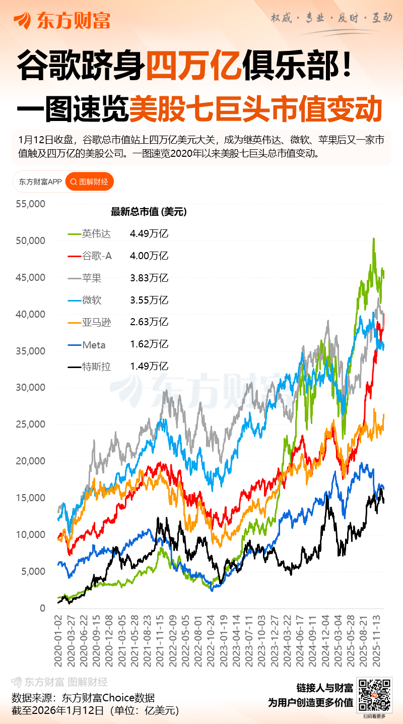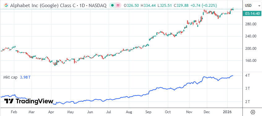 2025年,谷歌录得自2009年以来表现最好的一年,并在上周超越苹果成为全球第二最具价值的上市公司,仅次于英伟达。