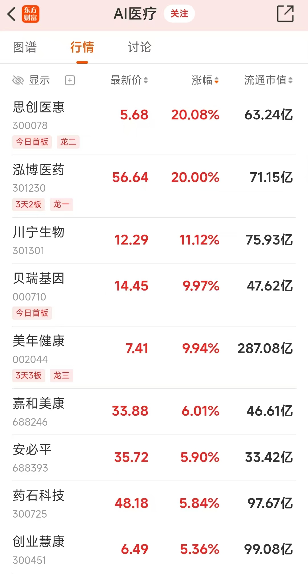 1月13日早盘,AI医疗表现强势,思创医惠、泓博医药(3天2板)、贝瑞基因、美年健康(3天3板)涨停;川宁生物大涨超10%。