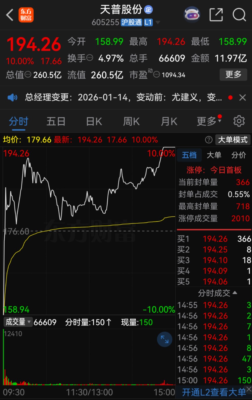 截至1月14日收盘,天普股份股价报194.26元/股,涨幅达10%,总市值为260.5亿元。