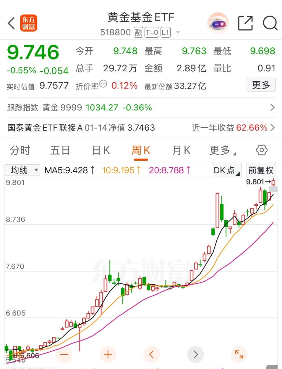 黄金基金ETF(518800)是国内头部黄金ETF,规模超300亿元,流动性活跃。其90%以上资产投资于上海黄金交易所Au99.99实物黄金,跟踪金价精准,综合费率低至0.6%/年。近期随金价走强表现亮眼,连续多日获资金净流入。