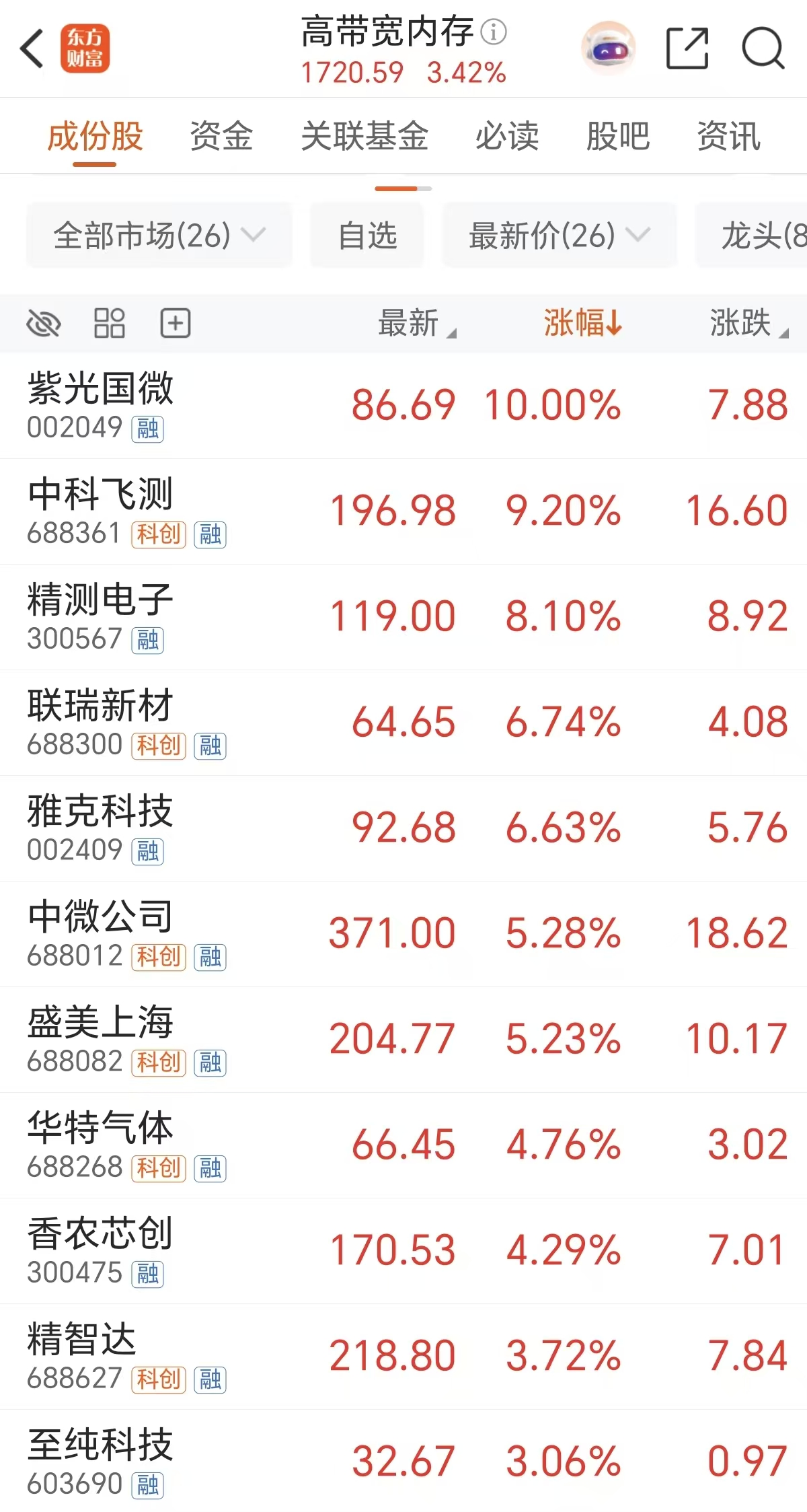 德明利、澜起科技、佰维存储、东芯股份、长川科技、英唐智控、华海诚科、聚辰股份、深科技等个股融资净买额在17.5亿元至5亿元之间不等。