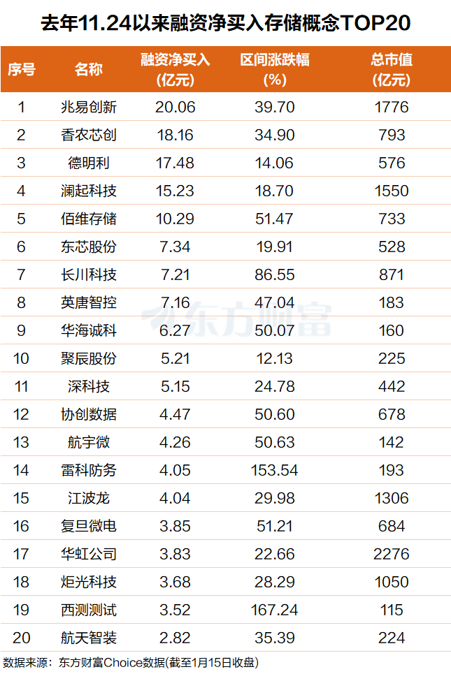 具体来看,兆易创新排名第一,融资净买入超20亿元,期间上涨近40%;香农芯创排名第二,融资净买入超18亿元,期间上涨35%。