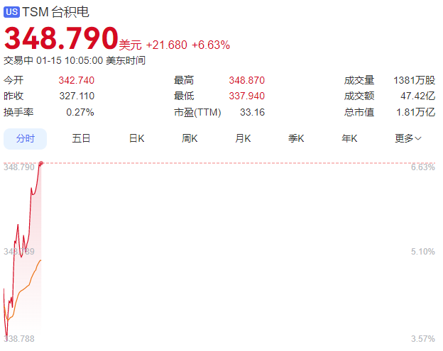 台积电总市值突破1.8万亿美元。公司1月15日发布的季度业绩显示,得益于人工智能硬件需求的持续强劲,公司利润增长显著超越市场预期。财报显示,2025年第四季度,台积电净利润为5057亿新台币,同比增长35%,创出新高;公司合并营收为1.46万亿新台币,同比增长20.5%,市场预估为1.03万亿新台币;营业利润为5649亿新台币,同比增长32.7%,市场预估5272.3亿新台币;营业利润率为54%,市场预估50.9%;毛利率为62.3%,同比提升3.3个百分点,市场预估60.6%。