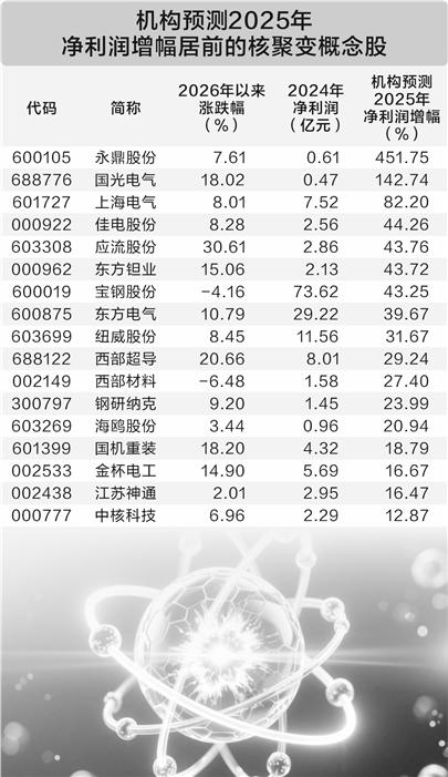 根据机构一致预测,有20只核聚变概念股2025年净利润有望实现增长(不含扭亏)。其中,机构一致预测永鼎股份和国光电气净利润有望翻倍,预测增幅分别为451.75%、142.74%;上海电气预测增幅超过80%;佳电股份、应流股份、东方钽业、宝钢股份预测增幅在40%以上。