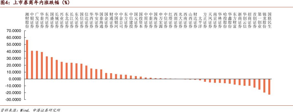 2025年度证券行业个股表现榜单显示,股价涨跌幅排名前五的为湘财股份、中银证券、广发证券、华泰证券、东兴证券,排名后五的则是国联民生、锦龙股份、第一创业、首创证券、招商证券。