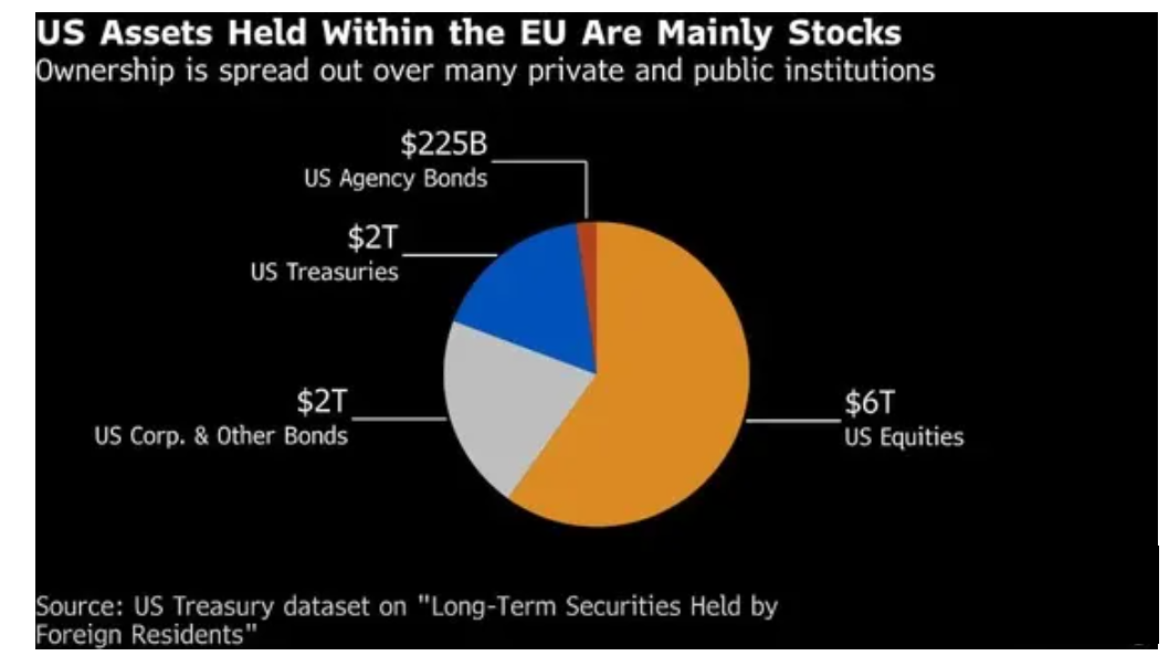 据财联社,美国财政部数据显示,欧盟持有的美国资产总额超过10万亿美元,其中6万亿是美股,2万亿是美国国债,2万亿美国公司债。