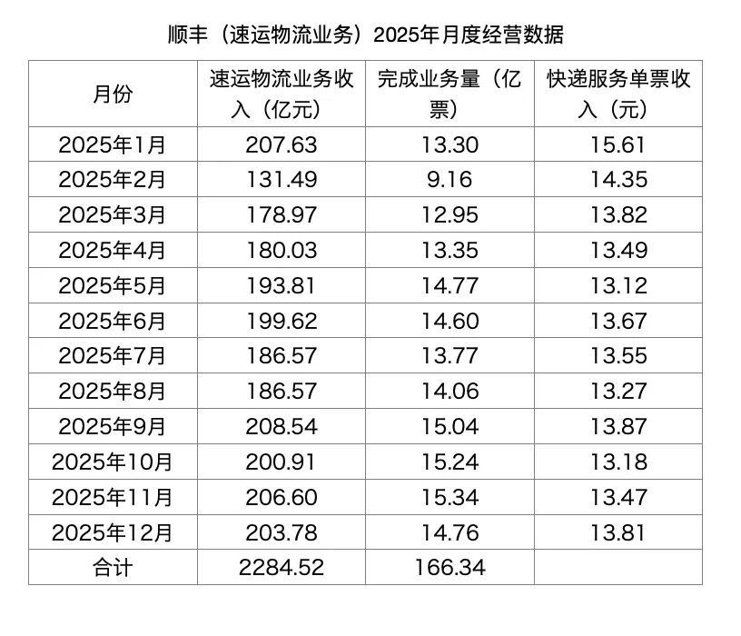 根据最新披露的月度经营数据,2025年12月,顺丰控股总营收273.39亿元,其中,速运物流业务营收203.78亿元,同比增长3.78%;业务量14.76亿票,同比增长9.33%;单票收入13.81元/票,同比下跌5.09%;供应链及国际业务营收达到69.61亿元,同比增长2.35%。