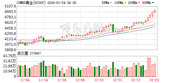 由于地缘政治动荡和对美国降息的预期,投资者纷纷涌入避险资产。1月23日现货白银首次突破100美元/盎司,最高触及103美元/盎司,大涨逾7%。黄金一度上涨超1%再创新高,逼近5000美元/盎司大关。