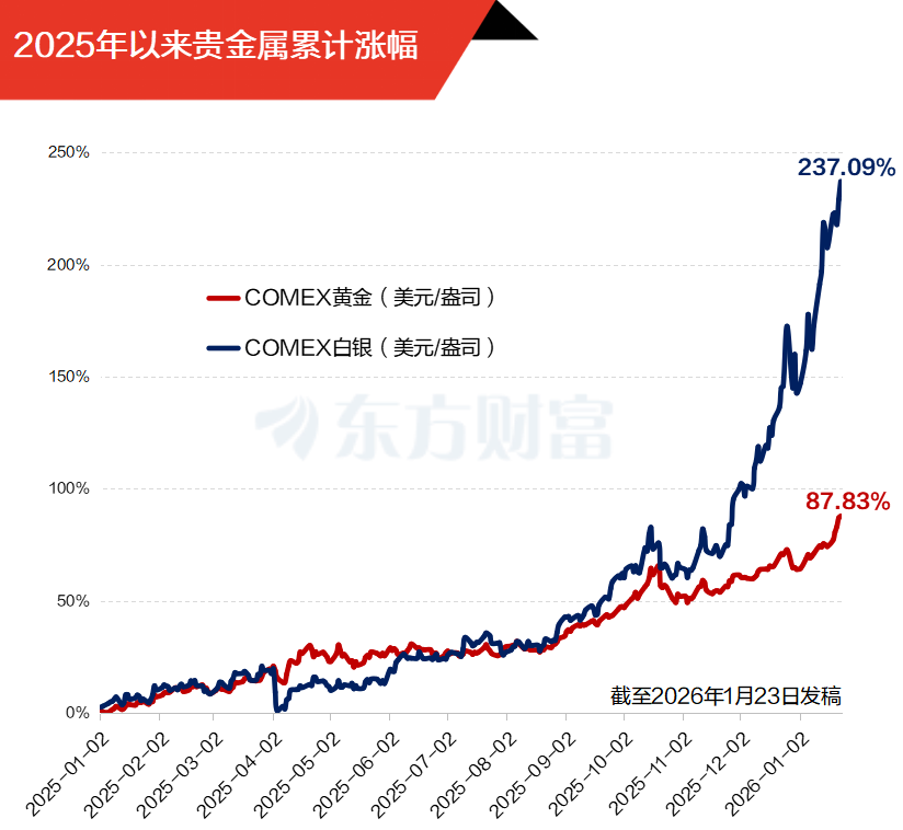 进入2026年后,贵金属继续走强。截至1月23日发稿,COMEX黄金最高涨至4970美元/盎司,已逼近5000整数大关,COMEX白银最高涨至99.2美元/盎司,离破百也已不远。2026年以来,COMEX黄金累计涨幅超14%,COMEX白银涨超40%。