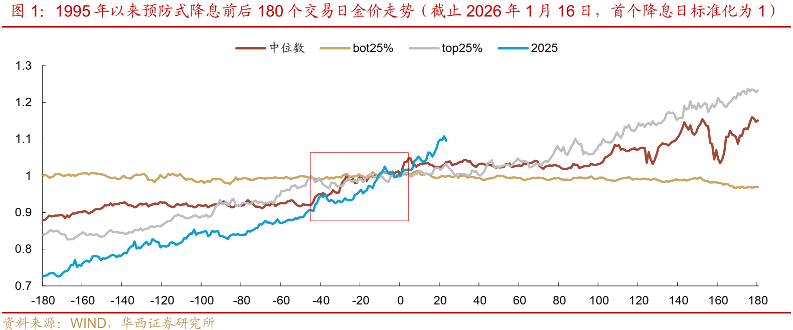 据华西证券统计,回顾1995年以来15轮预防式降息前后180个交易日金价中位数走势,可以发现降息前45天至降息后5天的时间,金价呈现加速上涨的趋势,期间累计涨幅约13.7%。