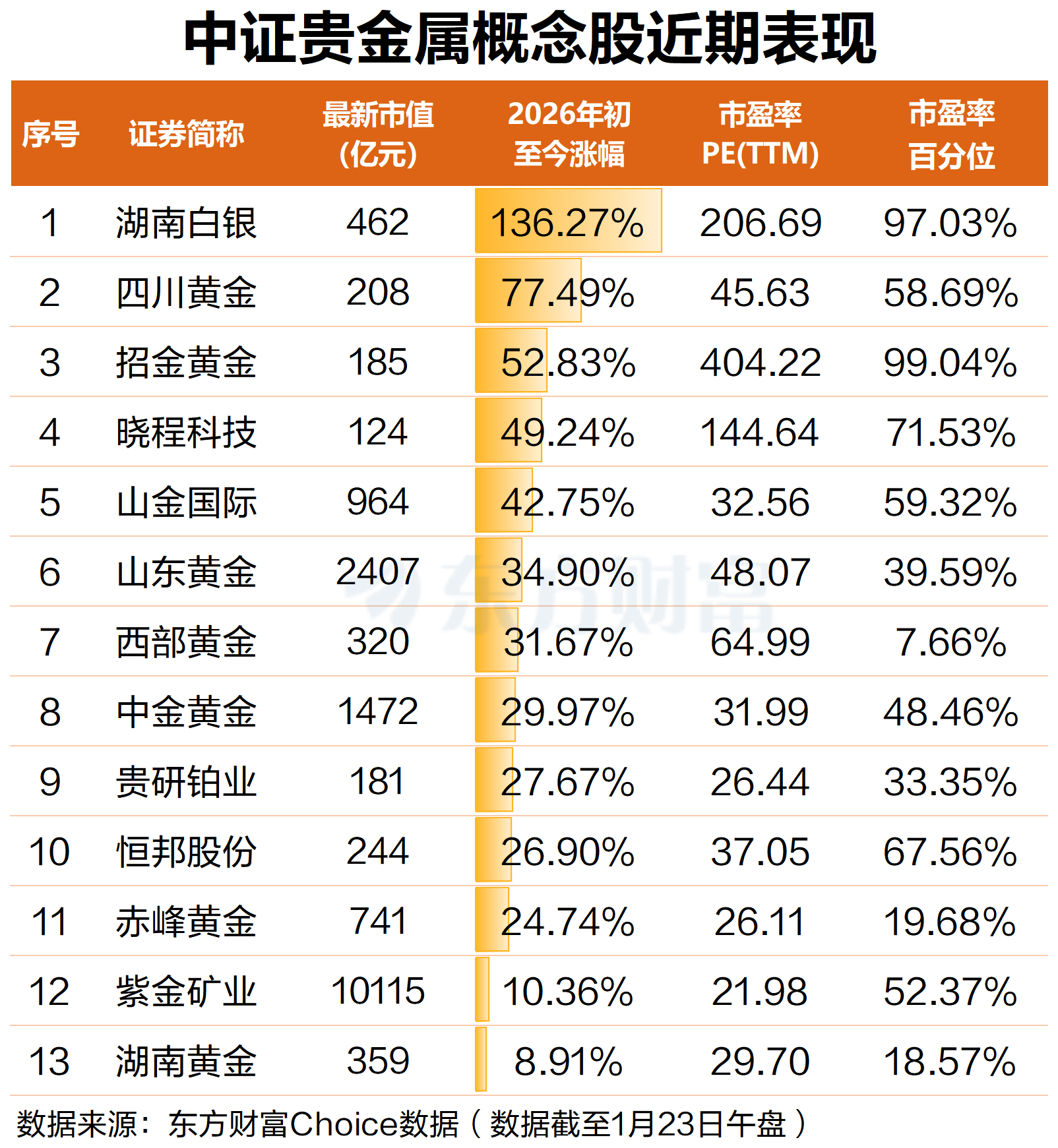 A股方面,据东方财富股票Choice数据,进入2026年后的15个交易日里,中证贵金属板块已涨近20%。成分股中,龙头湖南白银股价涨超136%,已然翻倍;四川黄金涨超77%,招金黄金涨超52%。此外,晓程科技、山金国际、山东黄金、西部黄金等也表现强势,涨幅均超30%。值得注意的是,在经历近两年的大涨后,不少贵金属概念股市盈率已然高企,个别股票已处于近十年90%以上的市盈率百分位。