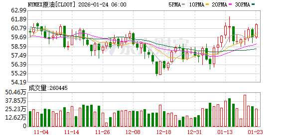 商品市场:国际油价01月23日上涨。截至当天收盘,纽约商品交易所WTI原油期货当月连续合约上涨1.92美元,收于每桶61.28美元,涨幅为3.23%。COMEX黄金期货当月连续合约上涨69.70美元,涨幅1.42%,报4983.1美元/盎司。COMEX白银期货当月连续合约上涨6.89美元,涨幅7.15%,报103.26美元/盎司。现货黄金上涨52.23美元,涨幅1.06%,报4988.6美元/盎司。现货白银上涨7.02美元,涨幅7.30%,报103.2美元/盎司。