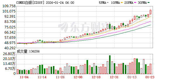 在避险资产需求激增、全球各地散户疯狂买入推动下,现货白银价格历史性地突破了每盎司100美元大关,延续了近期的炽热涨势。周五(1月23日)纽约时段,现货白银升破100美元,最高时涨4.5%报每盎司100.58美元。年初至今银价已累涨逾40%,在2025年银价已实现了近148%的年度涨幅。