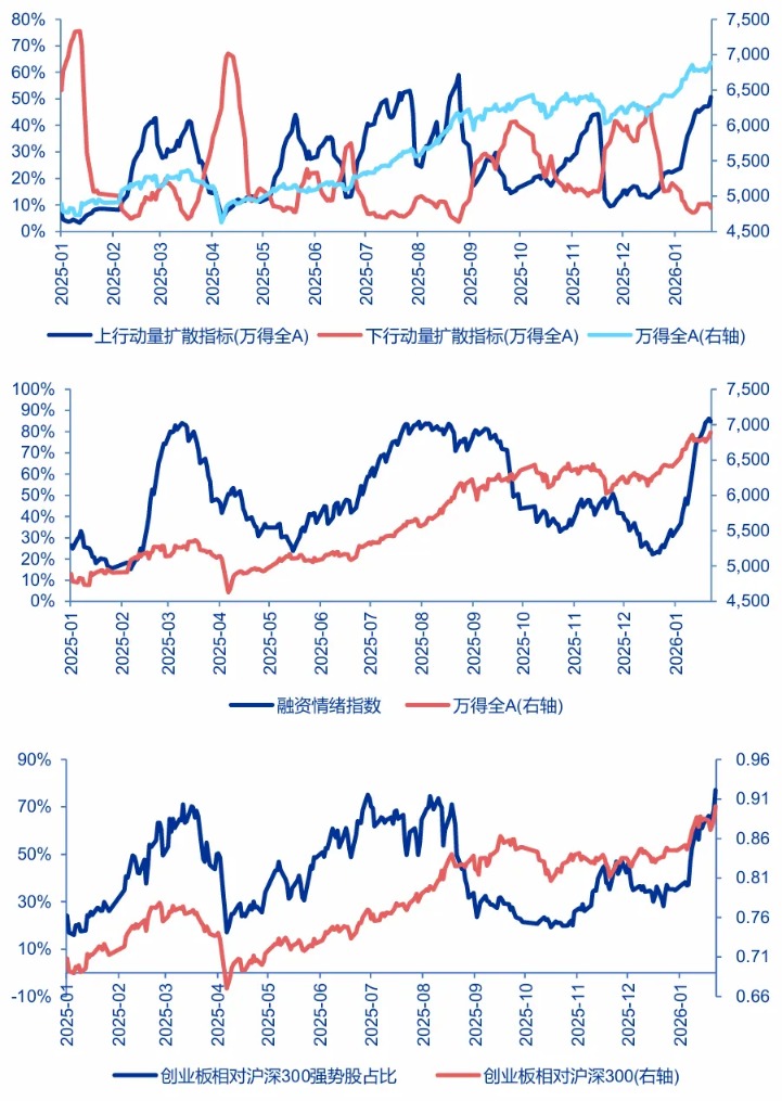 上周我们讨论了将“行稳致远”纳入策略体系,短期过度交易的方向修正。开门红行情提前进入板块轮动阶段,但春季行情演绎的既定路径尚未被破坏。春季行情的既定路径:春季增量博弈(年前中证A500ETF冲量,年后保险开门红、外资回流预期为基础;居民增配权益 + 交易性资金活跃度提升 + 存量加仓成为边际资金) + 有利于做多窗口连续(1月在排除经济下行风险的前提下,市场下行风险较小,2月期待春节科技催化,3月两会十五五落地,4月特朗普可能访华),市场具备完美春季行情的基础,核心特征是完整的板块轮动和充分的赚钱效应扩散。短期,产业趋势主题有所调整,底部资产挖掘走向深化。周期Alpha投资向周期拐点方向扩散,且短期股价有弹性。短期超跌的产业趋势主题,演绎反弹行情,其实也是底部资产挖掘的一部分。