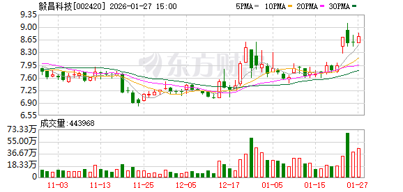截至1月27日收盘,毅昌科技涨2.1%,报8.75元/股,总市值为36亿元。