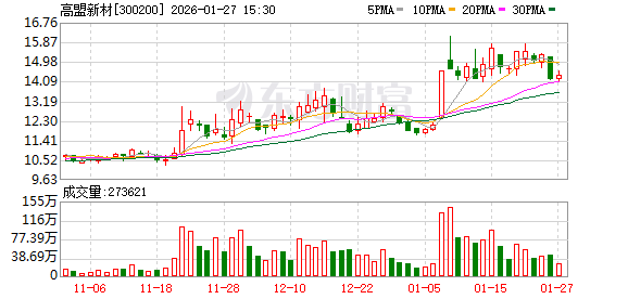1月7日,高盟新材曾涨停。截至27日收盘,高盟新材涨1.34%,报14.39元/股,总市值为62亿元。
