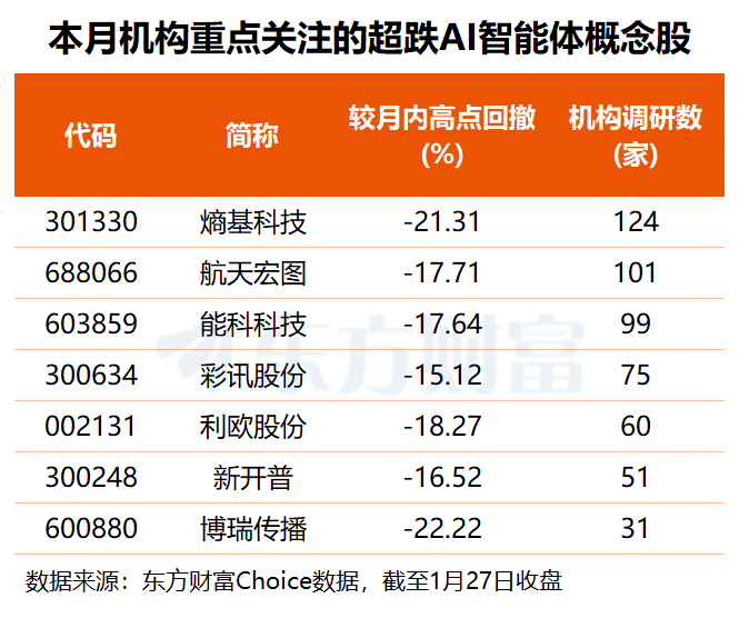东方财富Choice数据显示,截至1月27日收盘,共有53只AI智能体概念股较月内高点回撤超15%,南兴股份、卫宁健康回撤幅度接近30%。