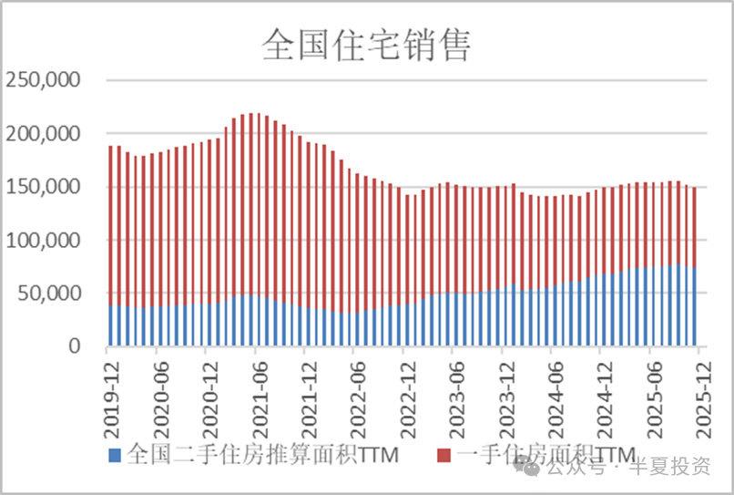 全国范围内的一手房和二手房成交合计,从21年到23年年初,下滑了约30%,之后已经企稳。