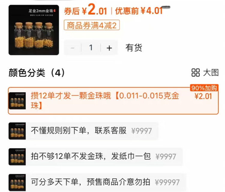 在短视频平台的某黄金直播间里,主播正在推销0.01克重的小金珠,1粒价格为24.9元,2粒价格为49.8元,除新客可以有6元减免外,并没有存在多买更便宜的情况。但10元运费的确会令人感到“只买一粒不划算”。