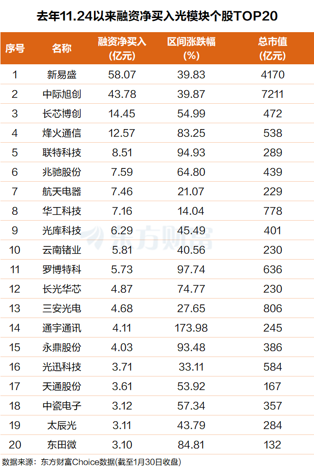 东方财富Choice数据显示,光模块指数自去年11月24日阶段性见底以来,融资客抢筹了一批相关个股,新易盛排名第一,融资净买入超58亿元;中际旭创排名第二,融资净买入44亿元。