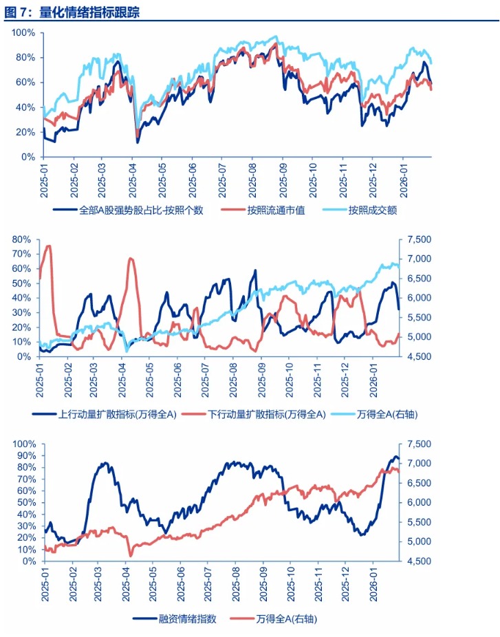 小波段定位:本周赚钱效应扩散触及历史高位区域,现已高位回落;A股浮盈同样触及历史高位后回落,平均持仓时间仍处于历史极低值,过度交易特征客观存在。结构上,开门红行情率先上涨的部分科技方向(国防军工、传媒、计算机)短期极低性价比后,现已有所缓和(但仍处于低性价比区域)。而本周强动量的顺周期则来到了短期极低性价比区域,板块内在稳定性下降。近期“行稳致远”政策下,上涨行情保持了韧性,但市场自身力量已经在逐步退坡。