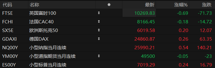 周五盘前,美股三大股指期货震荡盘整,欧洲主要指数涨跌不一。截至发稿,纳斯达克100指数期货涨0.54%,道指期货跌0.05%,标普500指数期货涨0.24%。