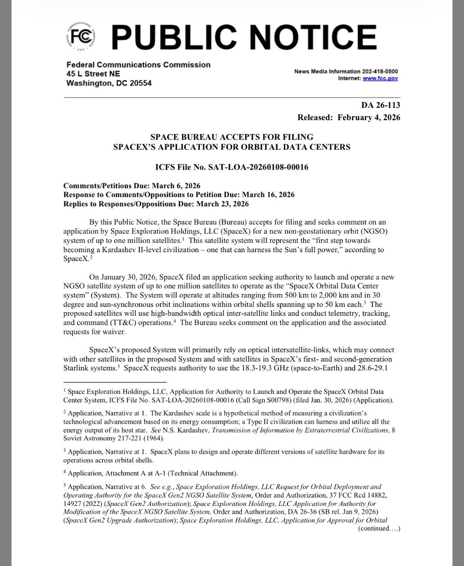美国联邦通信委员会主席布伦丹·卡尔(Brendan Carr)在社交媒体平台上发文称:“美国联邦通信委员会欢迎SpaceX公司提交的轨道数据中心申请,并现征求公众意见。”
