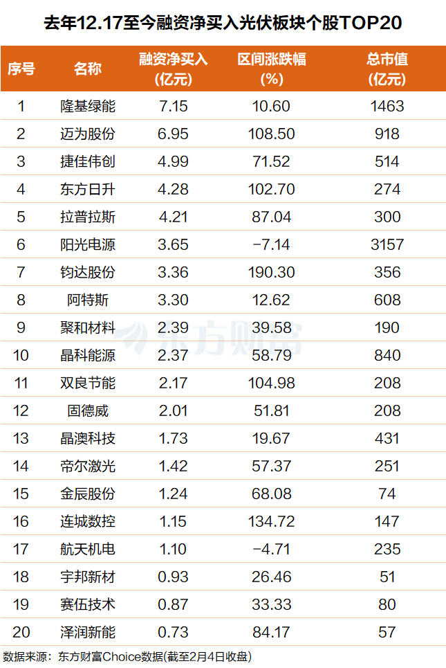 具体来看,隆基绿能排名第一,融资净买入超7亿元;迈为股份排名第二,融资净买入近7亿元。