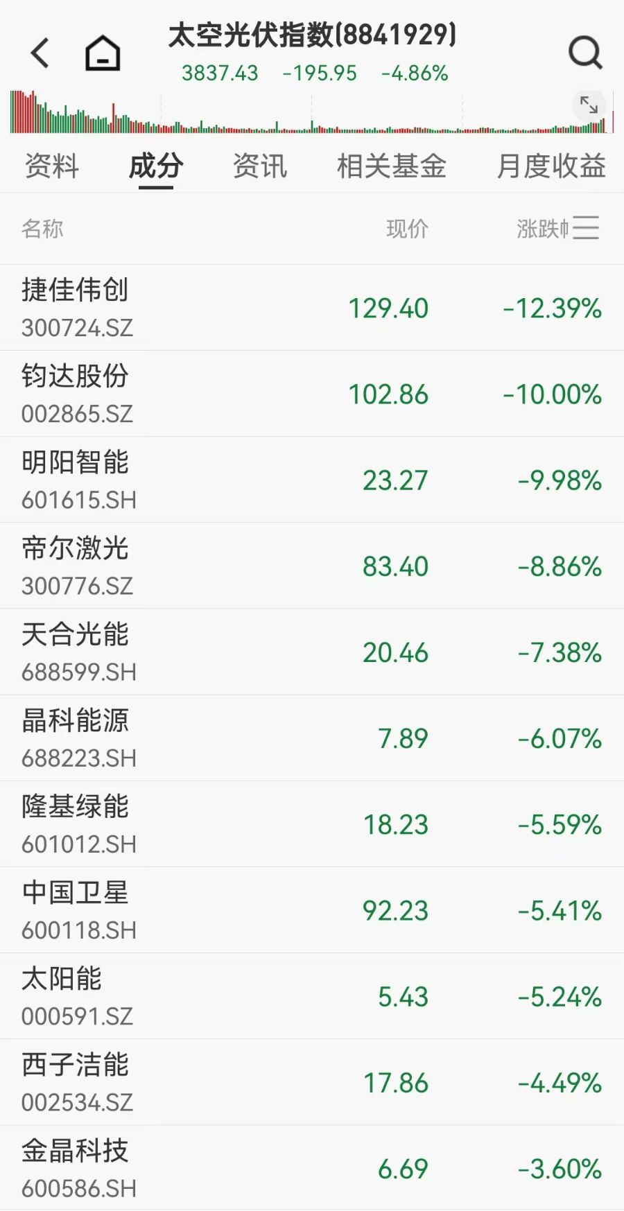 然而,2月5日太空光伏概念没能延续前一日的火爆行情,太空光伏指数(8841929)跌4.86%,钧达股份、金辰股份、双良节能跌停,高测股份、捷佳伟创、迈为股份、晶盛机电、海优新材等个股跌超9%。天合光能跌超7%,晶科能源跌超6%,金晶科技跌超3%。