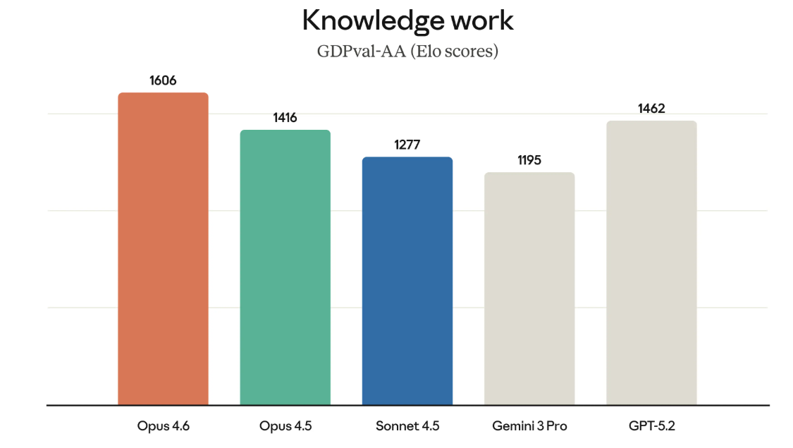 在评估AI模型在金融、法律等知识工作任务表现的GDPval-AA测试中,Opus 4.6比起行业次佳模型(GPT-5.2)多拿了近10%的分数。