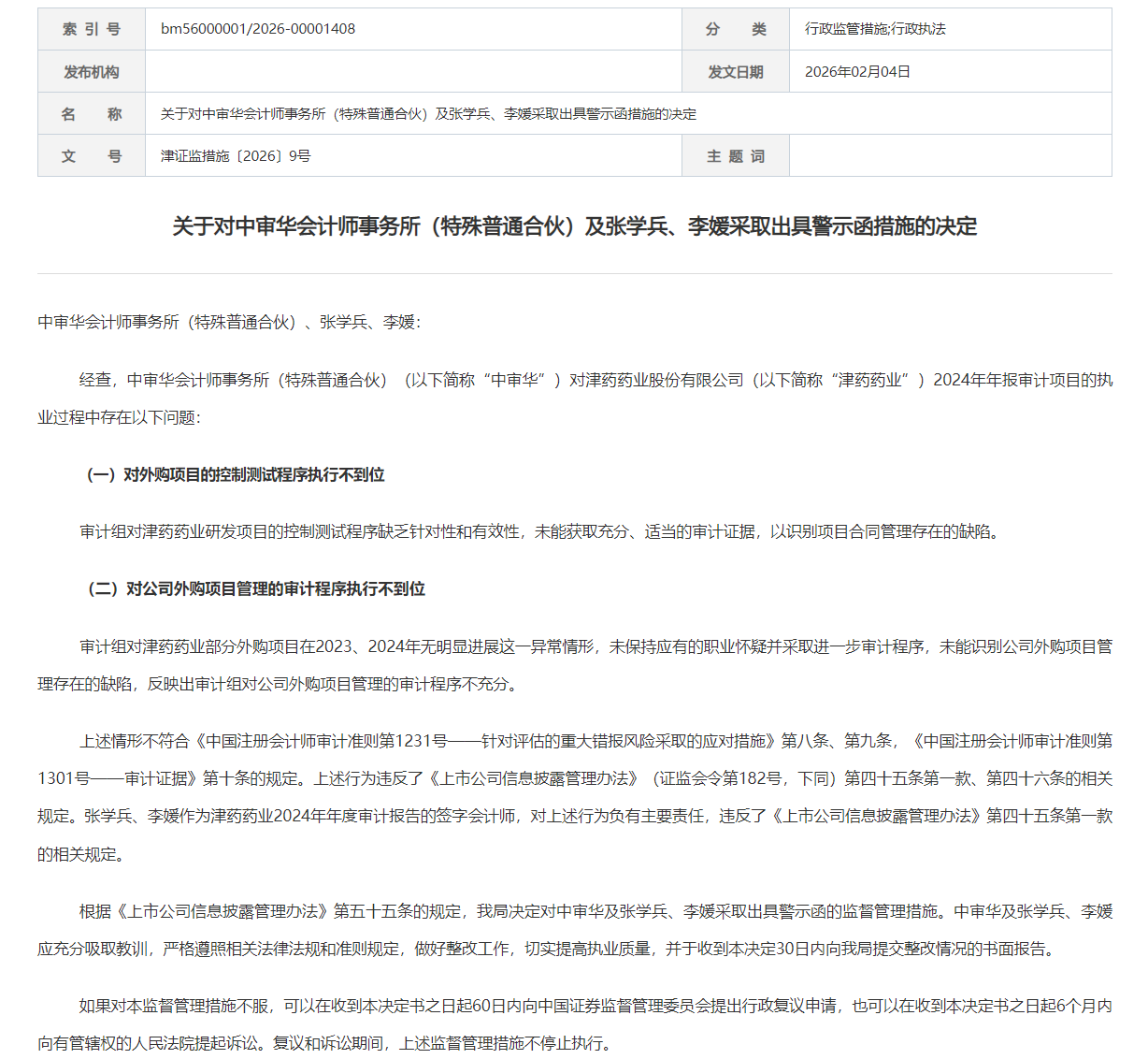 2月4日,天津证监局发布《关于对中审华会计师事务所(特殊普通合伙)及张学兵、李媛采取出具警示函措施的决定》。