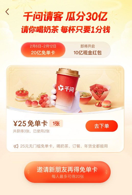 千问App活动页面显示,第一波免单活动时间为2月6-12日。用户更新千问App后,就可以拿到一张25元无门槛免单卡,不仅能免单喝奶茶,也能通过淘宝闪购买年货、点外卖。