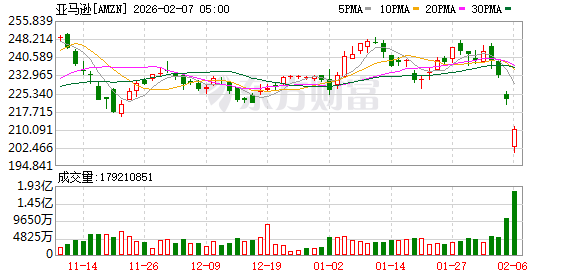 亚马逊收盘跌超5%,盘中一度跌超10%,公司预计2026年资本支出或达2000亿美元,该笔巨额支出计划引发市场担忧,多家券商下调其目标价。