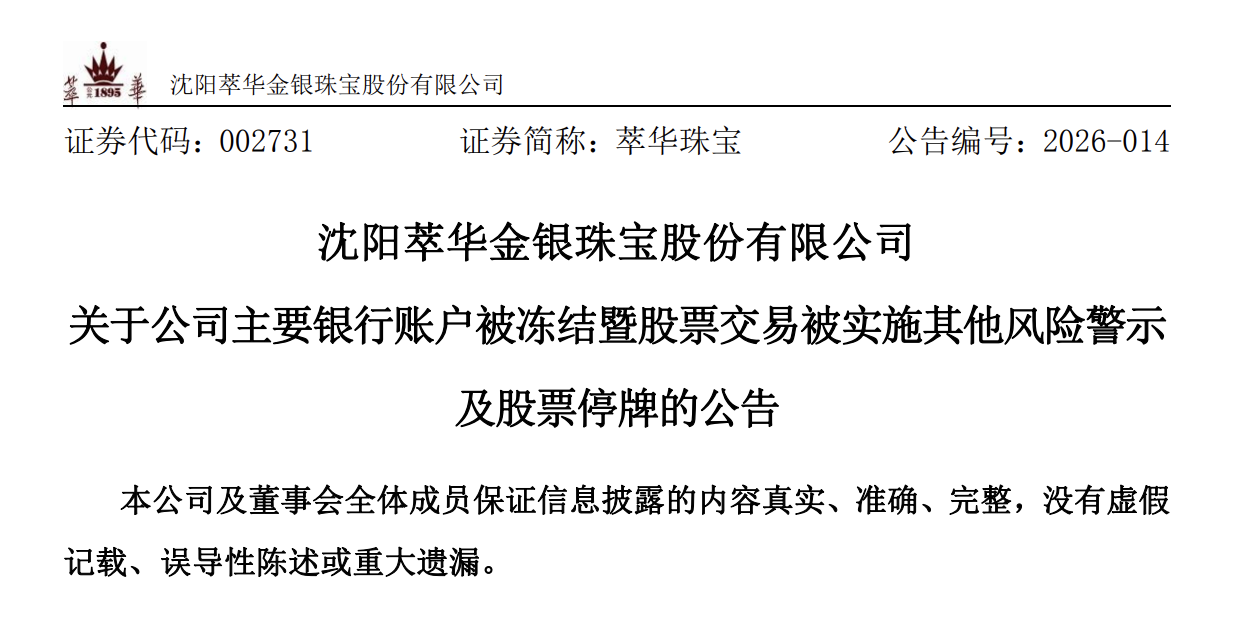 萃华珠宝表示,公司股票将于2026年2月9日开市时起停牌一天,于2026年2月10日开市时起复牌,复牌后公司股票被实施其他风险警示,股票简称由“萃华珠宝”变为“ST萃华”。