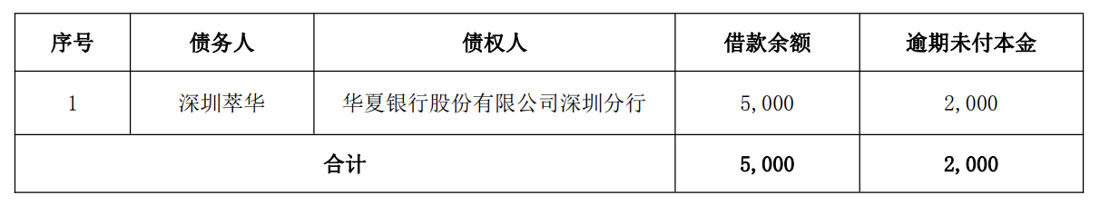 另一份公告显示,萃华珠宝子公司深圳市萃华珠宝首饰有限公司(以下简称“深圳萃华”)由于流动资金紧张,出现部分借款未能如期偿还的情形。截至公告披露日,深圳萃华新增一笔借款逾期,逾期未付本金2,000万元,公司及子公司累计借款逾期本金为2.54亿元。
