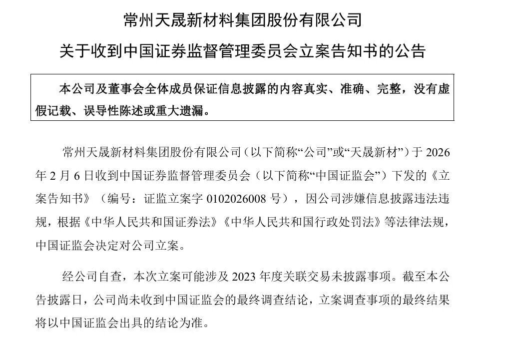 2月6日晚间,天晟新材发布公告称,2026年2月6日,公司收到中国证监会下发的《立案告知书》,因公司涉嫌信息披露违法违规,根据《中华人民共和国证券法》《中华人民共和国行政处罚法》等法律法规,中国证监会决定对公司立案。