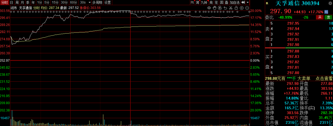 今日,市场热议的“易中天”组合(新易盛、中际旭创、天孚通信)同步飙升。天孚通信一度“20cm”涨停,股价创历史新高。新易盛、中际旭创、天孚通信成交额均超100亿元。