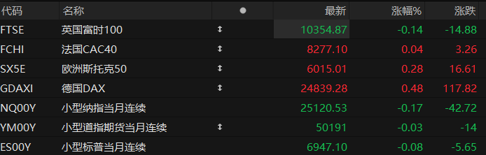 周一盘前,美股三大股指期货齐跌,欧洲主要指数多数上涨。截至发稿,纳斯达克100指数期货跌0.17%,道指期货跌0.03%,标普500指数期货跌0.08%。