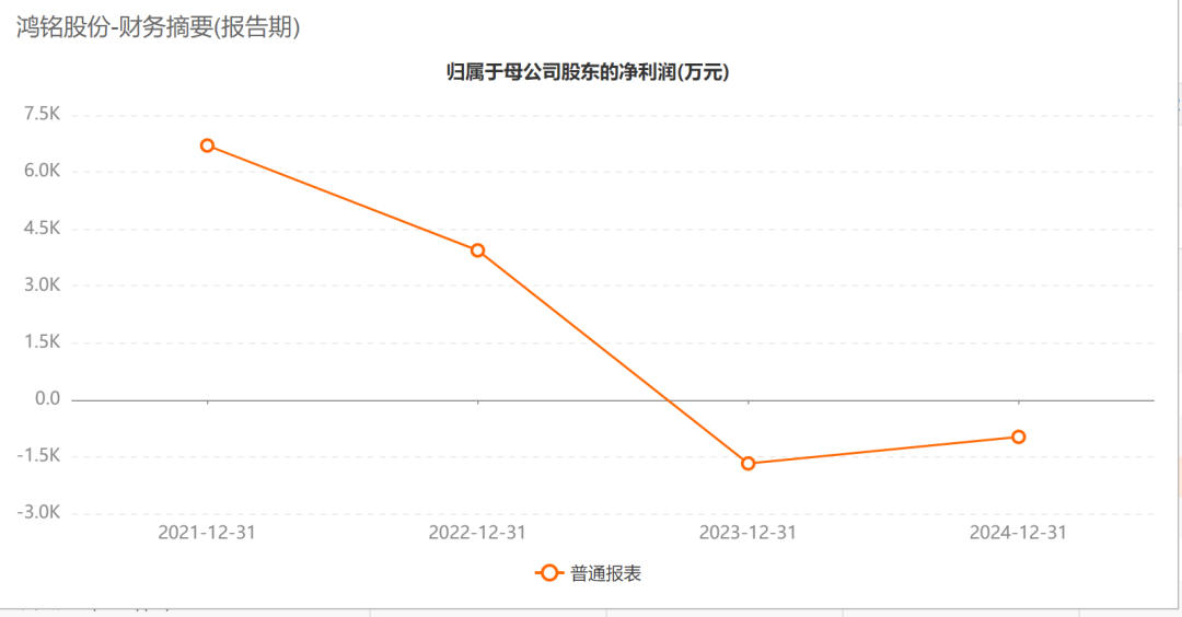 财务资料显示,自上市以来,鸿铭股份在2023年和2024年已连续两年亏损,营收也较前几年有所下滑。2023年至2024年,公司营收分别为1.75亿元、2.01亿元;归母净利润分别为-1677.33万元、-977.09万元。