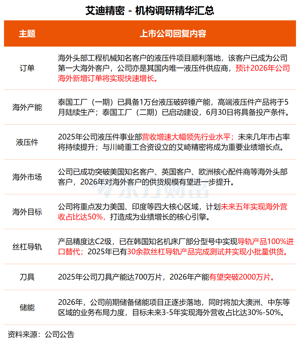 艾迪精密近日接受摩根士丹利、野村东方国际证券、天弘基金、中金公司等近50家机构调研,公司在调研中透露,海外头部工程机械知名客户的液压件项目顺利落地,其中50%订单将由泰国工厂生产并供应北美市场,剩余50%订单由中国工厂生产并供应非北美市场。“目前这一知名客户已成为公司第一大海外客户,公司亦是其国内唯一的液压件供应商,预计2026年公司海外新增订单将实现快速增长。”