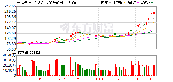 截至2月10日收盘,长飞光纤再度涨停,最新股价已突破200元/股。至此,该股近12个交易日已累计涨近90%。