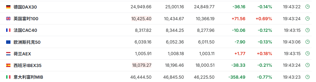 正在交易的欧洲股市涨跌不一,德国DAX指数现跌0.14%,英国富时100指数涨0.69%,法国CAC40指数跌0.12%。
