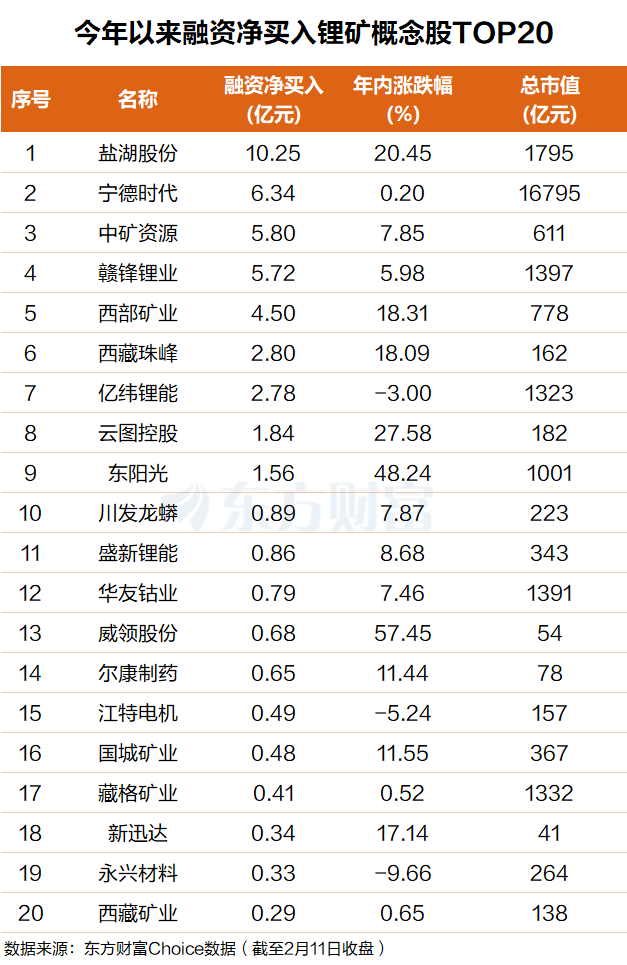 东方财富Choice数据显示,截至2月11日,今年以来杠杆资金抢筹了一批锂矿概念股,盐湖股份排名第一,融资净买入超10亿元;宁德时代排名第二,融资净买入超6亿元。