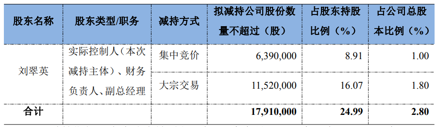 公告显示,本次减持主体为公司董事、财务负责人、副总经理刘翠英女士,其与公司控股股东、实际控制人、董事长唐健为夫妻关系,共同为公司实际控制人,合计持有公司股份239,740,027股,占公司总股本的比例为37.4717%。刘翠英女士计划自本公告披露之日起15个交易日后的3个月内(即2026年3月13日至2026年6月12日)通过深交所集中竞价和大宗交易方式减持公司股份合计不超过17,910,000股(占本公司总股本的比例不超过2.80%)。其中,通过集中竞价方式减持不超过6,390,000股(即连续90个自然日内减持股份的总数不超过公司总股本的比例不超过1%),通过大宗交易方式减持不超过11,520,000股(即连续90个自然日内减持股份的总数不超过公司总股本的比例不超过2%)。